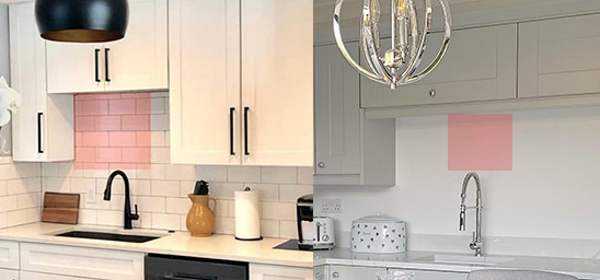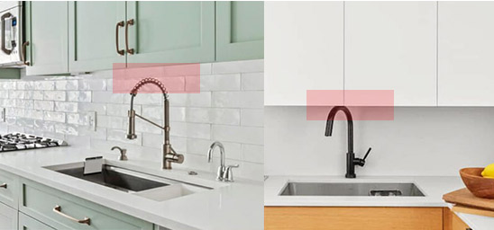 水栓のアーチ状フォルムを生かすことを優先したらしい施工例を探したところ、シンクに面する壁はオープンにしてるか、キャビネットを吊る高さをかなり上方に上げてる。キャビネット全体の平行線がデコボコしてしまうけど、私は下図の施工例のやり方に軍配上げたい。チビの私はあまり感じないけど、立ってて目線のすぐ先がキャビネットだとシンク使ってるあいだ圧迫感もあるはず。