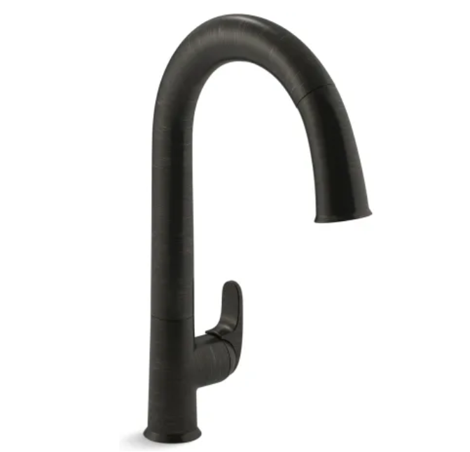 こういう個性的、というかステートメント力が強い水栓は開放的なアイランドに付いてるシンク向きなんだと思う。頭がぶつかりそうな高さにキャビネットが付いてる壁寄りのシンクには窮屈そう。高さが18インチ(およそ45センチ)もあるのです。美しいアーチ状フォルムがすぐ上に付いてるキャビネットで生かされてない施工例だらけ。