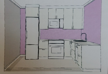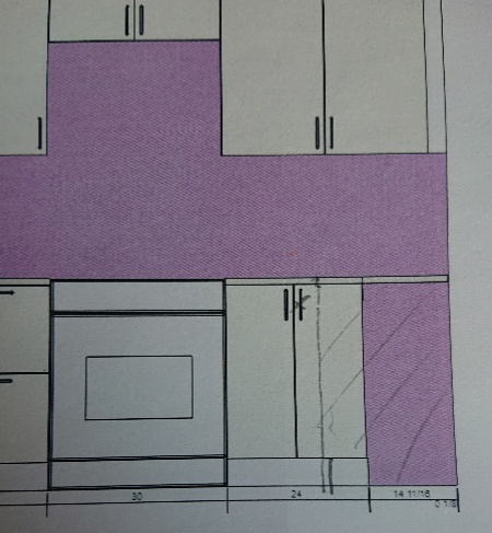 3:この際、大理石風ラミネート天板にして工期短縮するか?という話もした。すると、バックスプラッシュ壁もラミネートとなっちゃうか、そこだけタイル貼り?