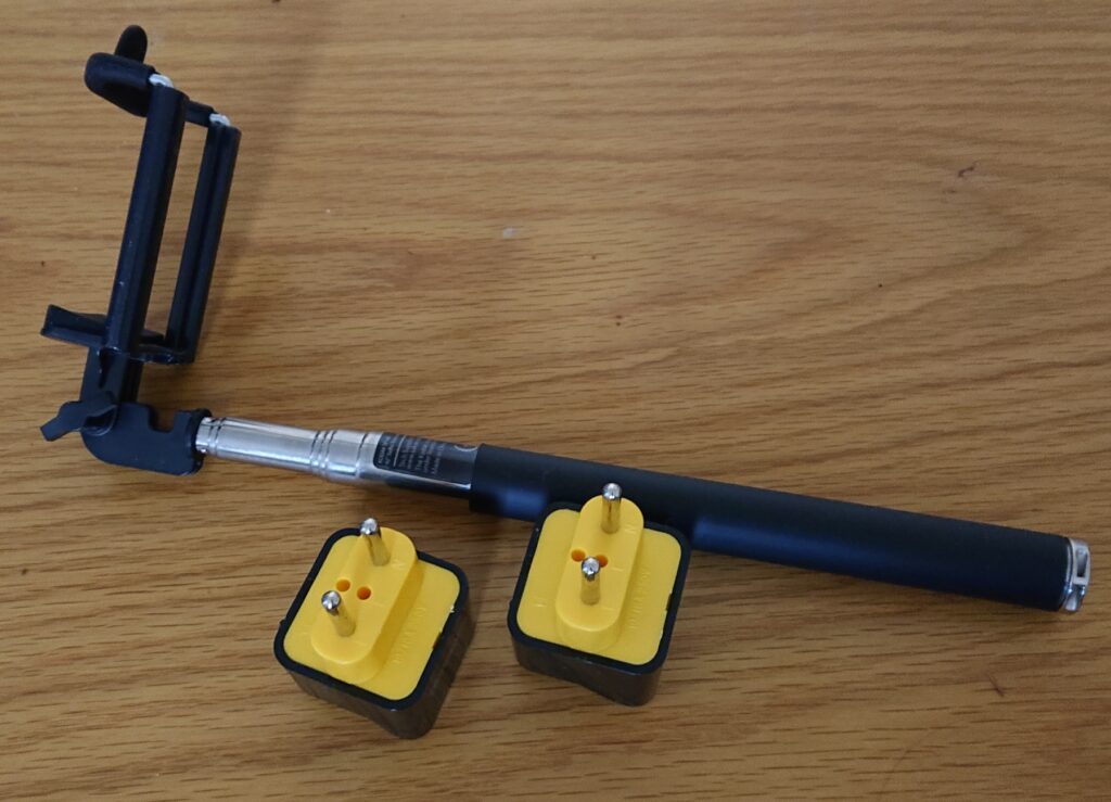ソロ旅行なのでセルフィー棒もね。そうそう、電源アダプターも。20年前のアナログ旅行では電気製品持ち歩かなかったので要らなかったもの。5年前にフィンランドに乗り換え一泊したときにプラグが合わずに空港隣のヒルトンホテルの部屋では充電できず不自由な体験したことありました。