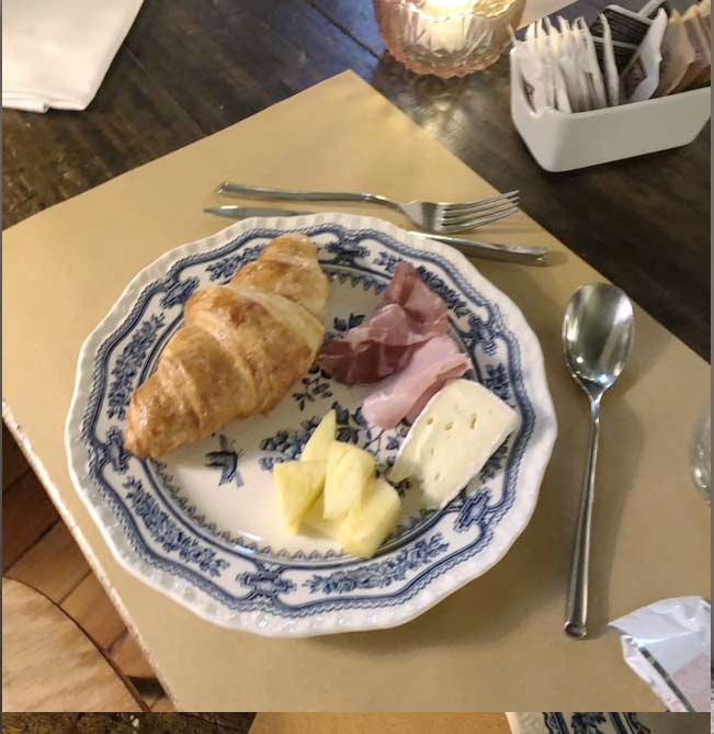 イタリア旅行は20年ぶり近くご無沙汰なので比較評価しにくい。朝食フロアが地下だったり窓無しなのは嫌で、そこは予約前に写真で確認してたどおり中庭に面してた。朝からケーキなんて食べないし、肉やハムはなるべく食べない私。チーズとスクランブルエッグあったのは嬉しい。小さめクロワッサンが山盛り。私好みのバター利いてるタイプじゃないので軽い食感。一個だけ頂く。自己に課してる掟破ってハムも食べてみた。