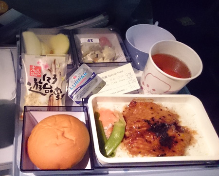 セントレアでのチェックイン時には何も注文しなかったのですが、機内食は今回は中華航空マイレージ会員登録で入れたミールの選択が取り入れられてまして、シーフードミールを早々と届けてくれました。最初のミールは台中で食べたのと同じ魚の照り焼き風、2食目はフィッシュフライとパスタ。野菜が少なくて見た目はナンですが、まぁまぁ美味しい。例に洩れずコーヒーとお茶のサービスが回ってきます。コーヒーをドブンと勢いよく注ぐアテンダントさんの豪快さ、、、もう驚かない。ちなみにセントレア~台北間でもシーフードミールを出してもらえたものの、デザートはゼリー、、、。ゼリーが動物性原料だという認識が日本人にはないんですねぇ。